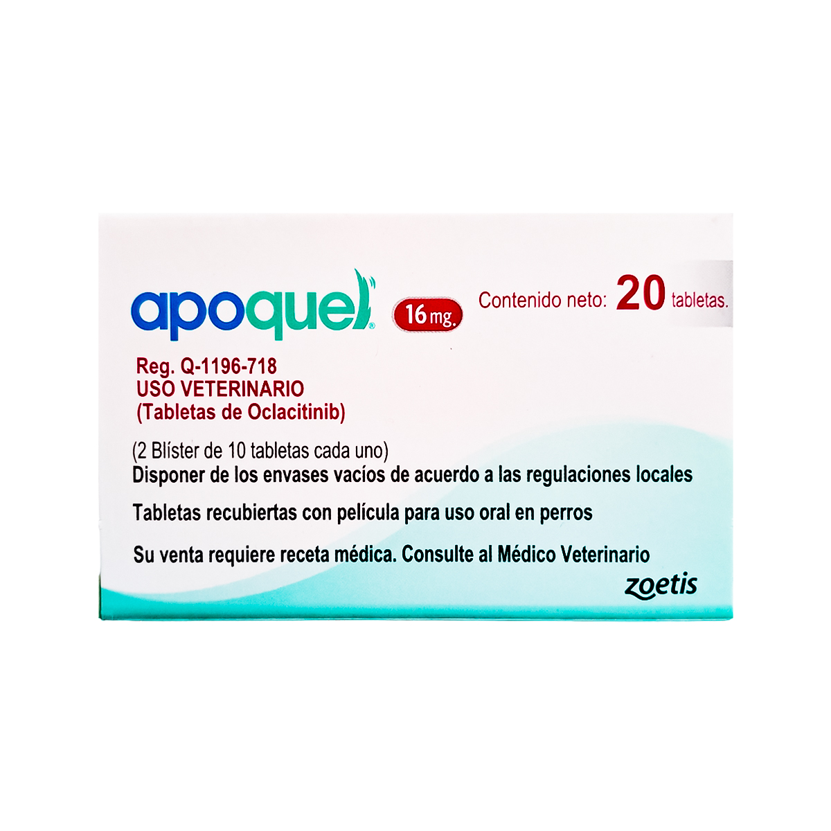 Apoquel® es un tratamiento eficaz para el prurito causado por dermatitis alérgica y las manifestaciones clínicas de la dermatitis atópica en perros. Su principio activo, Maleato de Oclacitinib, actúa inhibiendo las enzimas Janus Quinasa (JAK), brindando alivio rápido de la picazón y la inflamación.