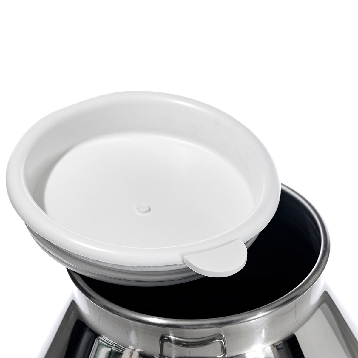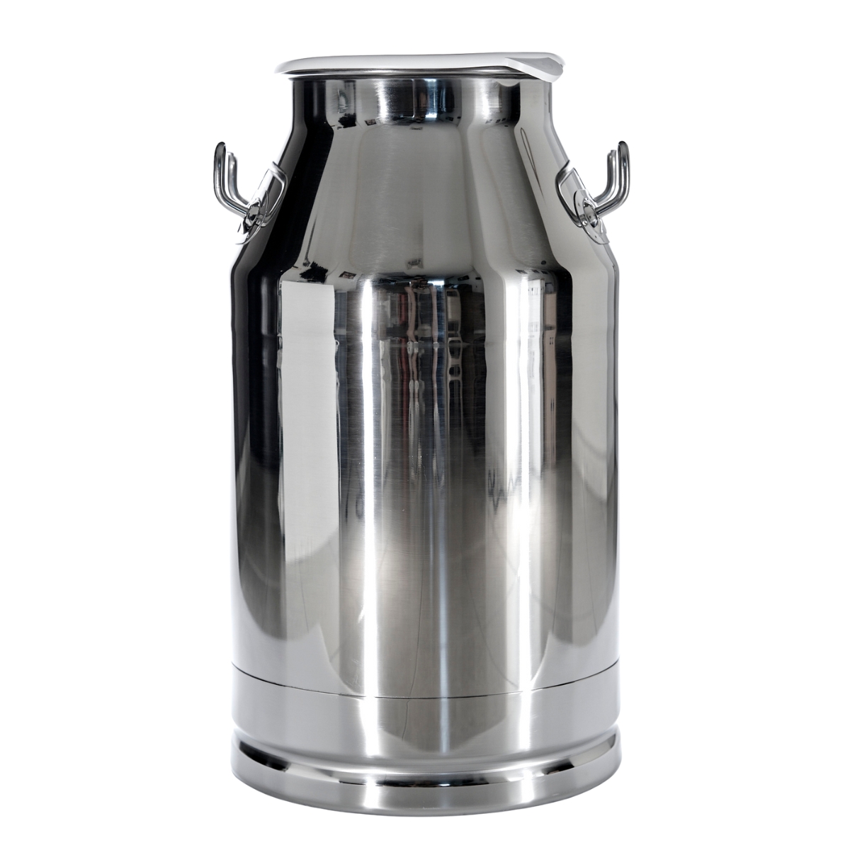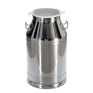 Bote de acero inoxidable para uso principalmente en la industria lechera elaborado de una sola pieza con tapa de goma blanca.