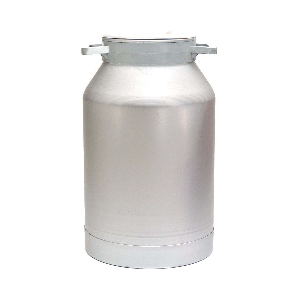 Bote de aluminio para uso principalmente en la industria lechera elaborado de una sola pieza con tapa de goma blanca.