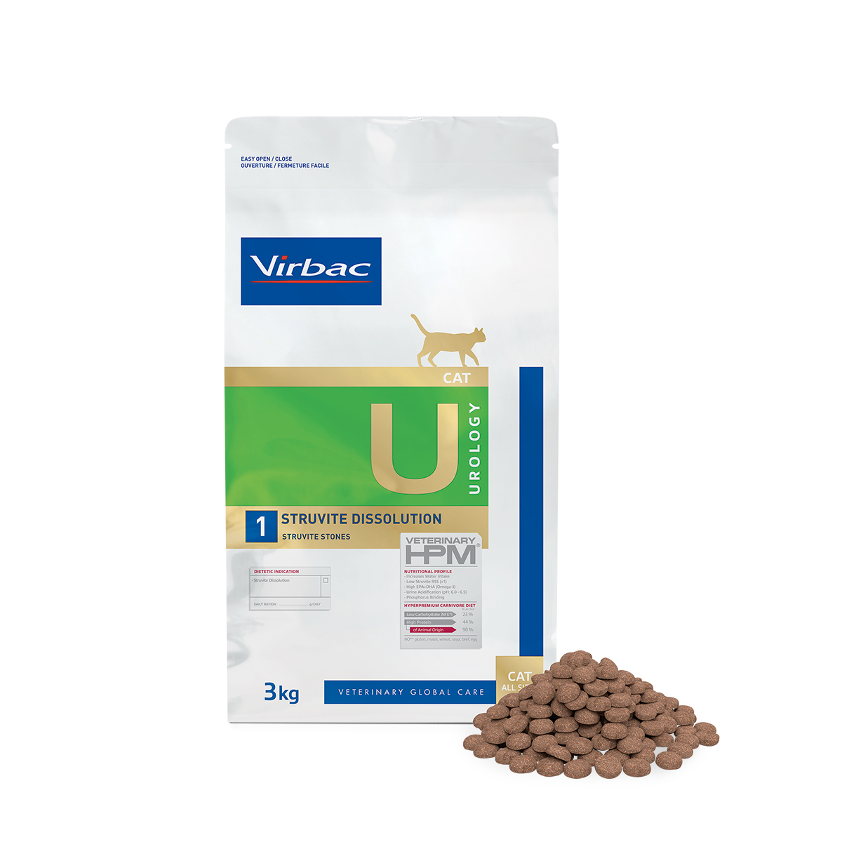 Veterinary HPM Urology 1 Struvite Dissolution es una alimentación dietética, indicada para la disolución de cálculos de estruvita (entre 5 y 12 semanas).