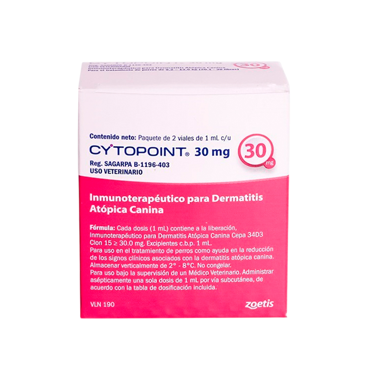 CYTOPOINT® es un tratamiento innovador para perros en forma de líquido estéril, listo para usar. Contiene un anticuerpo monoclonal caninizado (mAb) que actúa específicamente contra la interleucina-31 (IL-31), ayudando a aliviar el prurito asociado a la dermatitis alérgica y las manifestaciones clínicas de la dermatitis atópica. Proporciona un alivio rápido, seguro y duradero del picor, mejorando la calidad de vida de tu mascota. Presentacion 30mg