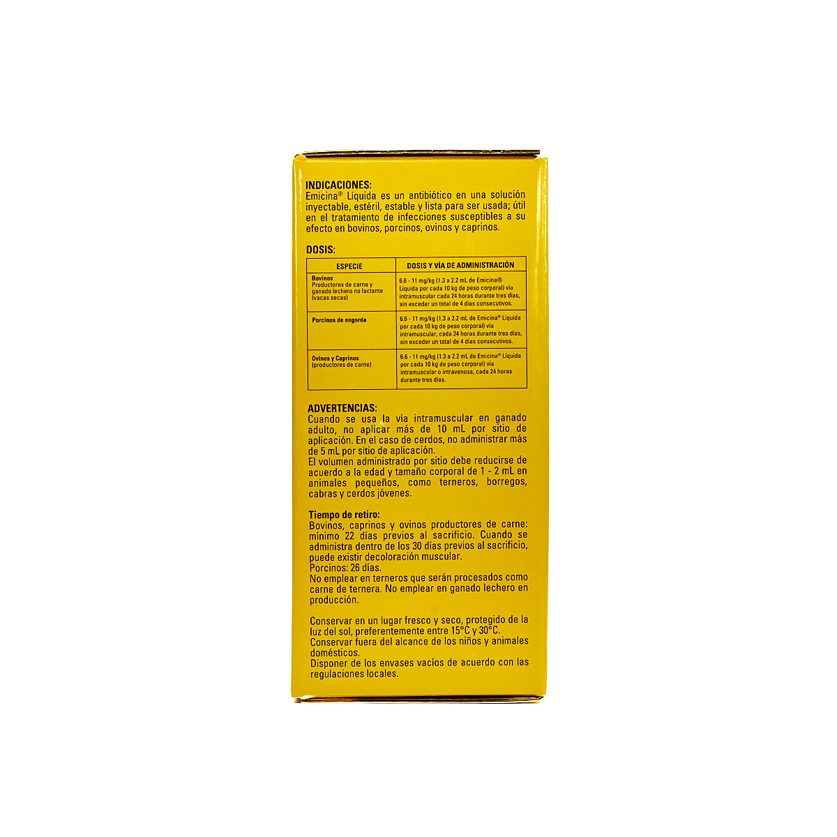 Emicina® Líquida es un antibiótico de amplio espectro en una solución inyectable, estéril, estable, y lista para ser usada; útil en la prevención y tratamiento de infecciones susceptibles a su efecto en bovinos, ovinos y caprinos.