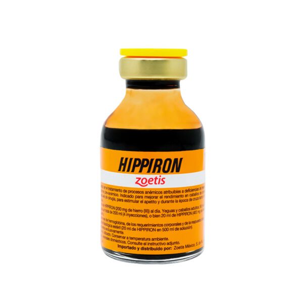 HIPPIRON es una solución hematínica estéril a base de un complejo polinuclear de hidróxido férrico y sacarosa, diseñada para administración intravenosa en equinos. Ayuda en el tratamiento y prevención de la anemia por deficiencia de hierro, mejora el rendimiento y la oxigenación celular en caballos de competencia, y es útil antes y después de cirugías o durante la época de reproducción. Presentacion: 20ml Diametro 10cm